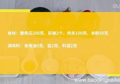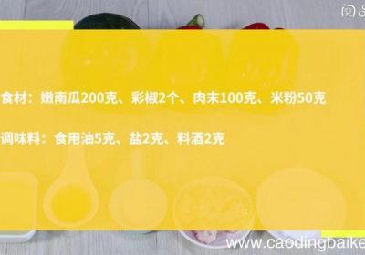 步骤1食材:嫩南瓜200克、彩椒2个、肉末100克、米粉50克 。调味料:食用油5克、盐2克、料酒2克 。步骤2彩椒竖向对半切开,清理干净内瓤 。步骤3嫩南瓜擦细丝 。步骤4热锅倒油,油温5成热时,下肉末,炒散,淋入料酒去腥 。【嫩南瓜酿彩...