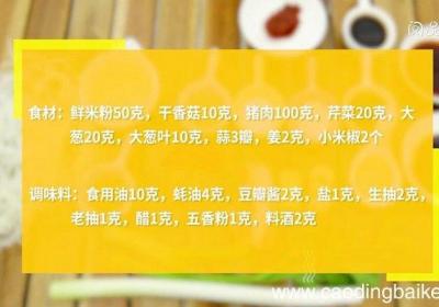 步骤1食材:鲜米粉50克,干香菇10克,猪肉100克,芹菜20克,大葱20克,大葱叶10克,蒜3瓣,姜2克,小米椒2个 。调味料:食用油10克,蚝油4克,豆瓣酱2克,盐1克,生抽2克,老抽1克,醋1克,五香粉1克,料酒2克 。步骤2干香菇用...