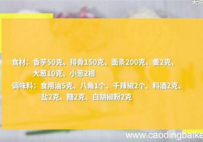 发布时间: 13小时前步骤1食材:香芋50克、排骨150克、面条200克、姜2克、大葱10克、小葱2根 。调味料:食用油5克、八角1个、干辣椒2个、料酒2克、盐2克、糖2克、白胡椒粉2克 。步骤2香芋切块 。步骤3小葱切葱花 。步骤4姜切片 。步骤5大葱切段 。...