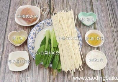 步骤1准备食材:面条200克、小白菜100克、鸡胸肉20克、盐1茶匙、胡椒粉1茶匙、香油1茶匙、生粉5克、姜1块 。步骤2小白菜掰成小片,清洗干净 。步骤3鸡胸肉洗净切丝 。步骤4姜切片 。步骤5碗中放入鸡胸肉、生粉抓匀备用 。步骤6起锅倒...