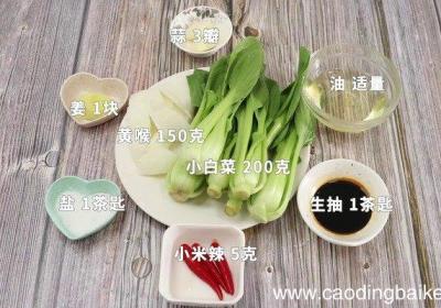 步骤1准备食材:黄喉150克、小白菜200克、小米辣5克、姜1块、蒜3瓣、生抽1茶匙、盐1茶匙、油适量 。步骤2黄喉洗净切小块 。步骤3小白菜洗净 。步骤4小米辣切圈 。步骤5姜切片 。步骤6蒜切片 。步骤7锅中烧热水,倒入黄喉焯水2分钟,...