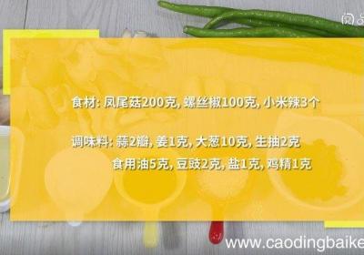 步骤1食材:凤尾菇200克,螺丝椒100克,小米辣3个,蒜2瓣,姜1克,大葱10克 。调味料:食用油5克,豆豉2克,盐1克,鸡精1克,生抽2克 。步骤2凤尾菇撕小朵 。步骤3蒜切片 。步骤4姜切丝 。步骤5大葱切片 。步骤6小米辣切片步骤7...
