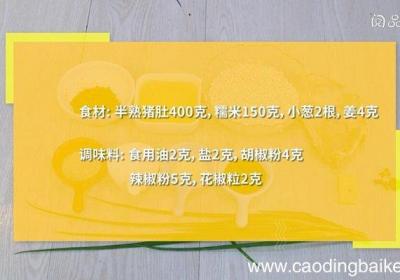 步骤1食材:半熟猪肚400克,糯米150克,小葱2根,姜4克 。调味料:食用油2克,盐2克,胡椒粉4克,辣椒粉5克,花椒粒2克 。【猪肚蒸糯米的做法 猪肚蒸糯米怎么做】步骤2半熟猪肚切条 。步骤3小葱切葱花 。步骤4姜切末 。步骤5糯米用清...