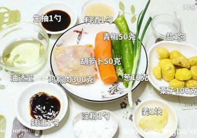 步骤1准备食材:鸡胸肉300克、栗子100克、油适量、盐1勺、料酒1勺、蚝油1勺、生抽1勺、葱10克、姜1块、胡萝卜50克、青椒50克、淀粉1勺 。步骤2将鸡胸肉切成丁 。步骤3鸡肉丁内加盐、料酒、生抽、淀粉、油腌制10分钟 。步骤4葱切段...
