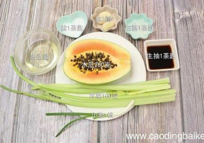 步骤1准备材料:木瓜200克、芹菜100克、油适量、盐1茶匙、蒜3瓣、白糖1茶匙、生抽1茶匙、小葱1根 。步骤2木瓜去皮,去掉瓜瓤瓜子,切成片 。步骤3芹菜洗净切段 。步骤4蒜切片 。步骤5小葱切葱花 。步骤6首先起锅烧热水,水开放入芹菜,...