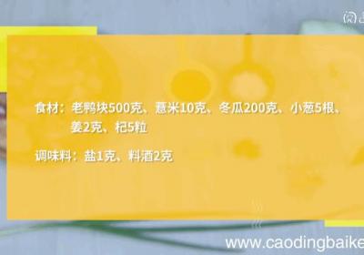 步骤1准备食材:老鸭块500克,薏米10克,冬瓜200克,小葱5根,姜2克,枸杞5粒,盐2克,料酒2克 。步骤2鸭肉洗净备用 。步骤3姜切片 。步骤4薏米、枸杞洗净 。步骤51根小葱切葱花 。步骤6冬瓜去瓤、去皮、洗净切块 。步骤7锅中加入...