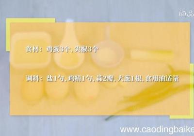 步骤1准备食材:鸡蛋3个、尖椒3个、盐1勺、鸡精1勺、蒜2瓣、大葱1根、食用油适量 。步骤2蒜拍碎、切末 。步骤3大葱切末 。步骤4尖椒洗净,切成小块备用 。步骤5鸡蛋磕入碗中,打散 。步骤6锅烧热,放入食用油,倒入鸡蛋液,用中小火煎熟,滑...