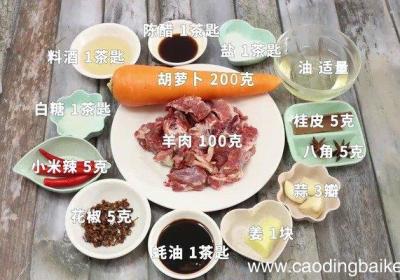 发布时间: 10小时前步骤1准备食材:羊肉100克、胡萝卜200克、八角5克、桂皮5克、花椒5克、蚝油1茶匙、料酒1茶匙、陈醋1茶匙、盐1茶匙、油适量、姜1块、蒜3瓣、小米辣5克、白糖1茶匙 。步骤2羊肉洗净备用 。步骤3胡萝卜去皮切块 。步骤4姜切片 。步骤5...