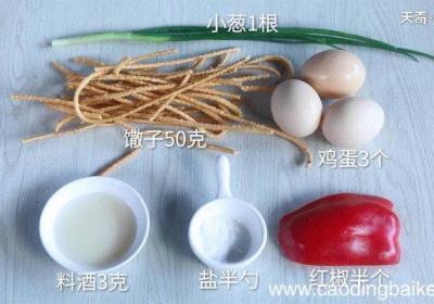 步骤1准备食材:鸡蛋3个、馓子50克、红椒半个、小葱1根、料酒3克、盐半勺 。步骤2红椒切丝 。步骤3葱切葱花 。步骤4鸡蛋打入碗中搅拌均匀,调入盐半勺、料酒3克,放入少量水,将馓子掰成小节放入鸡蛋中,搅拌均匀 。步骤5再放入切好的红椒和小...