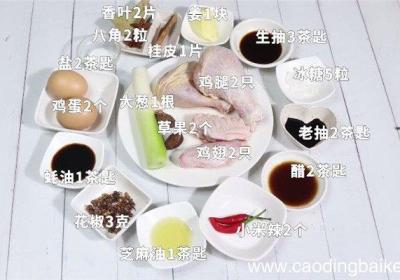 步骤1准备材料:鸡腿2只、鸡蛋2个、鸡翅2只、八角2粒、桂皮1片、草果2个、香叶2片、花椒3克、小米辣2个、大葱1根、姜1块、生抽3茶匙、老抽2茶匙、醋2茶匙、蚝油1茶匙、冰糖5粒、芝麻油1茶匙、盐2茶匙步骤2姜切片 。步骤3葱切段 。步骤...