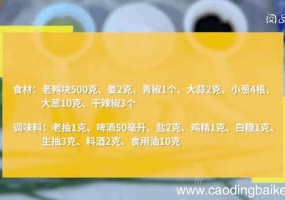 步骤1食材:老鸭块500克,姜2克,青椒1个,大蒜2克,小葱4根,大葱10克,干辣椒3个 。调味料:老抽1克,啤酒50毫升,盐2克,鸡精1克,白糖1克,生抽3克,料酒2克,食用油10克 。步骤2鸭肉洗净备用 。步骤3姜切片 。步骤4青椒去蒂...