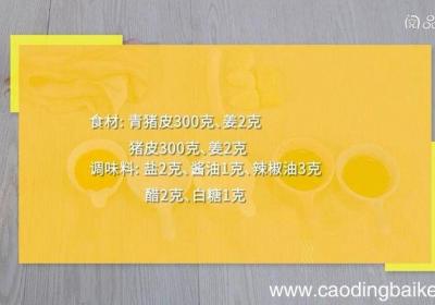 步骤1食材:猪皮300克、姜2克、大葱10克、大蒜3瓣 。调味料:盐2克、酱油1克、辣椒油3克、醋2克、白糖1克 。步骤2姜切片 。步骤3大葱切段 。步骤4大蒜切末 。【酸辣皮冻的做法 酸辣皮冻怎么做】步骤5猪皮放入冷水锅中,水沸后煮5分钟...