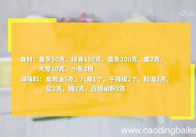 步骤1食材:香芋50克、排骨150克、面条200克、姜2克、大葱10克、小葱2根 。调味料:食用油5克、八角1个、干辣椒2个、料酒2克、盐2克、糖2克、白胡椒粉2克 。步骤2香芋切块 。步骤3小葱切葱花,姜切片,大葱切段 。热锅倒油,油温5...