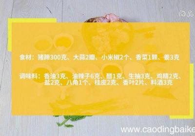 步骤1准备食材:猪蹄200克、大葱1段、桂皮1块、姜1片、香叶2片、八角2个、小茴香5克、冰糖4颗、盐1茶匙、老抽1茶匙、料酒1汤匙、孜然粉1茶匙、辣椒粉1茶匙、油适量 。步骤2葱切段 。步骤3姜切片 。步骤4猪蹄放热水中焯水捞出 。步骤5...