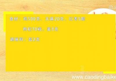 发布时间: 12小时前步骤1准备食材:鸡500克、天麻20克、红枣5颗、枸杞10粒、姜3克、盐2克 。步骤2姜切片 。步骤3锅中加入适量清水,放入少许姜片、鸡肉 。步骤4水沸后焯烫1分钟 。【天麻炖鸡的做法 天麻炖鸡怎么做】步骤5捞出,沥干水分 。步骤6砂锅中放...