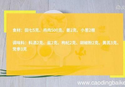 发布时间: 12小时前步骤1食材:田七5克,鸡肉500克,姜2克,小葱2根调味料:料酒2克,盐2克,枸杞2克,胡椒粉2克,黄芪3克,党参3克步骤2姜切片 。步骤3小葱切葱花 。步骤4锅中加入清水,放入鸡肉、料酒,煮10分钟,捞出 。步骤5砂锅中放入鸡肉、田七、黄...