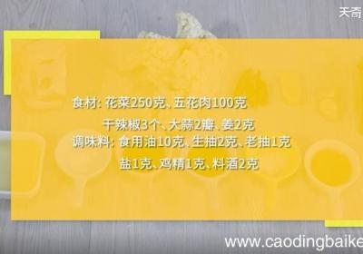 步骤1食材:花菜250克、五花肉100克、干辣椒3个、大蒜2瓣、姜2克 。调味料:食用油10克、生抽2克、老抽1克、盐1克、料酒2克 。步骤2花菜掰成小朵 。步骤3五花肉切薄片 。步骤4干辣椒切段 。步骤5【菜花炒肉的做法 菜花炒肉怎么做】...