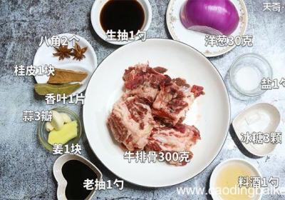 步骤1准备食材:牛排骨300克、八角2个、桂皮1块、香叶1片、姜1块、蒜3瓣、洋葱30克、冰糖3颗、生抽1勺、老抽1勺、料酒1勺、盐1勺 。步骤2姜切片 。步骤3蒜拍扁 。步骤4洋葱切块 。【卤牛排骨的做法 卤牛排骨怎么做】步骤5水中加入生...