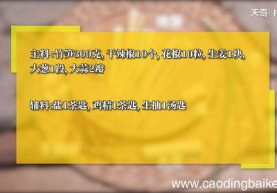 步骤1食材:竹笋300克,干辣椒10个,花椒10粒,生姜1块,大葱1段,大蒜2瓣、盐1茶匙,鸡精1茶匙,生抽1汤匙 。步骤2烤笋切丝 。步骤3干辣椒切段 。步骤4蒜切末 。步骤5姜切末 。步骤6大葱切片 。步骤7热锅下油,倒入花椒、干辣椒、...
