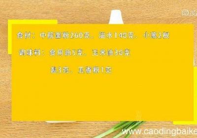 步骤1食材:中筋面粉260克、温水140克、小葱2根调味料:食用油5克、玉米油30克、盐3克、五香粉1克步骤2温水中加入200克面粉、2克盐,拌匀揉成面团步骤3醒发20分钟步骤4均分成8份,搓成圆形步骤5盆中放入60克面粉、玉米油、1克盐、...