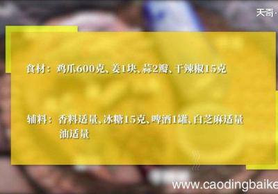 步骤1食材:鸡爪600克、姜1块、蒜2瓣、干辣椒15克 。辅料:香料适量、冰糖15克、啤酒1罐、白芝麻适量、 油适量 。步骤2鸡爪剪去指甲和鸡蹼,在爪心划上两刀 。步骤3鸡爪放入锅中,加料酒1勺、姜片,焯水后捞出 。步骤4锅中热油,下入蒜头...
