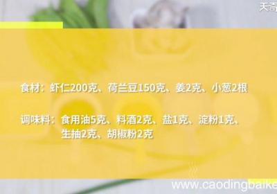 发布时间: 9小时前步骤1准备食材:虾仁200克、荷兰豆150克、姜2克、小葱2根、食用油5克、料酒2克、盐1克、淀粉1克、生抽2克、胡椒粉2克 。步骤2姜切末 。步骤3小葱切葱花 。步骤4荷兰豆去筋 。步骤5虾仁加料酒、淀粉、姜末、拌匀、腌制15分钟 。步骤...