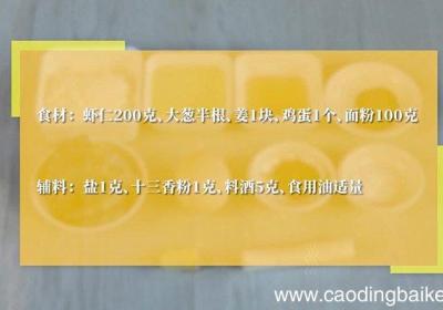 发布时间: 9小时前步骤1食材:虾仁200克、大葱半根、姜1块、鸡蛋1个、面粉100克 。辅料:盐1克、十三香粉1克、料酒5克、食用油适量 。步骤2大葱斜刀切小段 。步骤3姜切片 。步骤4虾仁洗净沥干水分,放入碗中,加入盐1克、料酒5克、大葱段、姜片拌匀,腌制...