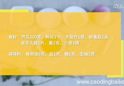 发布时间: 11小时前步骤1准备食材:节瓜200克,粉丝1个,干腐竹1根,鲜香菇2朵,金华火腿1片,姜2克,小葱1根、食用油5克,盐1克,糖1克,生抽2克 。步骤2节瓜去皮,切条 。步骤3火腿切丝 。步骤4干腐竹掰小块 。步骤5香菇洗净,切丝 。步骤6姜切末 。...