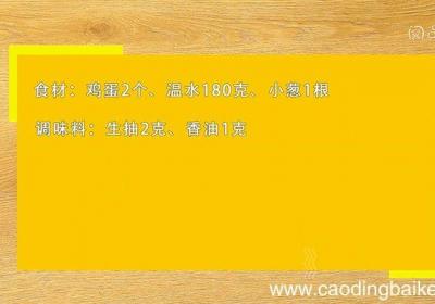 步骤1食材:鸡蛋2个、温水180克、小葱1根 。调味料:生抽2克、香油1克 。步骤2小葱切葱花 。步骤3鸡蛋打散,加入180克温水,搅拌均匀 。步骤4放入沸水蒸锅中,蒸10分钟 。步骤5取出,淋入生抽、香油 。步骤6撒上葱花即可 。【蒸水蛋...