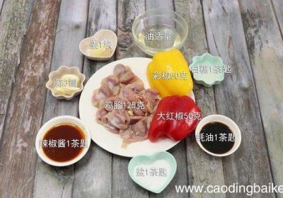 步骤1准备食材:鸡胗125克、彩椒50克,大红椒50克、姜1块、蒜3瓣、白糖1茶匙、蚝油1茶匙、辣椒酱1茶匙、盐1茶匙、油适量 。【彩椒菊花鸡胗的做法 彩椒菊花鸡胗怎么做好吃】 步骤2鸡胗洗净切菊花刀 。步骤3彩椒切小片 。步骤4红椒切小片...