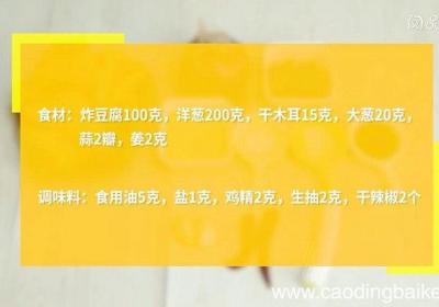 步骤1食材:炸豆腐100克,洋葱200克,干木耳15克,大葱20克,蒜2瓣,姜2克 。调味料:食用油5克,盐1克,鸡精2克,生抽2克,干辣椒2个 。步骤2炸豆腐切小块 。步骤3洋葱切块 。步骤4干木耳用温水泡发15分钟,切小块 。步骤5【木...
