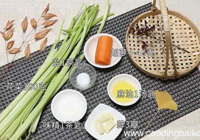 步骤1准备食材:芹菜300克、麻油1汤匙、盐1茶匙、味精1茶匙、蒜3瓣、胡萝卜40克 。步骤2蒜切末 。步骤3胡萝卜切丝 。步骤4芹菜切成段 。步骤5芹菜用沸水焯一下捞出装入碗中 。步骤6胡萝卜丝焯水捞出放入芹菜碗中 。步骤7冷却后放入蒜末...