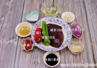 步骤1主料:猪肝200克、青椒10克辅料:洋葱10克、小米椒10克、蒜3瓣、姜1块、红椒1个、料酒1茶匙、油适量、盐1茶匙、生抽1茶匙步骤2猪肝洗净切片 。步骤3青椒切片 。步骤4红椒切片 。步骤5小米椒切圈 。步骤6洋葱切片 。步骤7姜切...