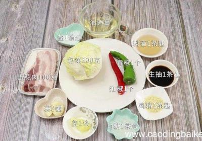 步骤1准备食材:包菜200克、五花肉100克、青椒1个、红椒1个、蒜3瓣、姜1块、料酒1茶匙、生抽1茶匙、白糖1茶匙、鸡精1茶匙、盐1茶匙、油适量 。步骤2包菜洗净撕成小片 。步骤3五花肉洗净切片 。步骤4青椒切圈 。步骤5红椒切圈 。步骤...