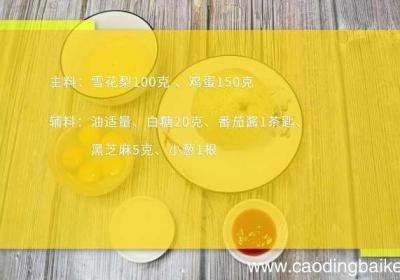 步骤1准备食材:雪花梨100克 、鸡蛋150克、油适量、白糖20克、番茄酱1茶匙、黑芝麻5克、小葱1根 。步骤2小葱切葱花 。步骤3【水果煎蛋的做法 水果煎蛋的做法】首先将雪花梨去皮去核,在切成细丝放入碗中,加入10克白糖和少许油搅拌均匀备...