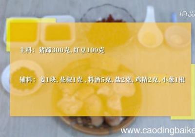 步骤1准备食材:猪蹄300克、红豆100克、姜1块、花椒1克、料酒5克、盐2克、鸡精2克、小葱一根 。【红豆炖猪脚怎么做,红豆炖猪脚做法】步骤2红豆提前浸泡24小时 。步骤3姜切片 。步骤4葱切葱花 。步骤5锅中放入适量清水,放入猪蹄、花椒...