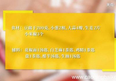 步骤1食材:豆腐干200克、小葱2根、大蒜4瓣、生姜2片、小米椒3个 。辅料:花椒面1茶匙、香油1汤匙、白芝麻1茶匙、鸡精1茶匙、盐1茶匙、醋半汤匙、生抽1汤匙 。步骤2豆干加入清水清净,切成小条 。步骤3红辣椒切碎 。步骤4姜切末 。步骤...