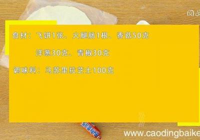 步骤1食材:飞饼1张、火腿肠1根、香菇50克、洋葱30克、青椒30克 。调味料:马苏里拉芝士100克 。【手卷披萨的做法 手卷披萨怎么做】步骤2火腿肠切小丁 。步骤3香菇切片 。步骤4洋葱切丝 。步骤5青椒切小丁 。步骤6飞饼放置软化,将上...