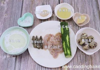 步骤1珍珠鱼肚海参汤主料:海参60克、鱼肚200克、鹌鹑蛋5个辅料:黄瓜40克、高汤1碗、姜1块、香油1茶匙、盐1茶匙、胡椒粉1茶匙步骤2鱼肚洗净 。步骤3姜切片 。步骤4黄瓜洗净切条 。步骤5海参洗净备用 。步骤6鹌鹑蛋煮熟后剥皮备用 。...