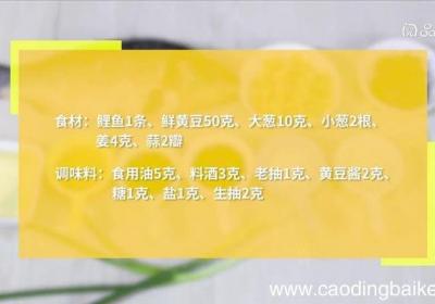步骤1食材:鲤鱼1条、鲜黄豆50克、大葱10克、小葱2根、姜4克、蒜2瓣 。调味料:食用油5克、料酒3克、老抽1克、黄豆酱2克、糖1克、盐1克、生抽2克 。步骤2鲤鱼两面切花刀、小葱切葱花、蒜切片、姜切片、大葱切段 。步骤3锅里倒油、油温4...
