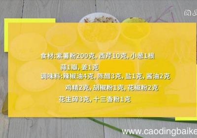 步骤1食材:紫薯粉200克,西芹10克,小葱1根,蒜1瓣,姜1克 。调味料:辣椒油4克,陈醋3克,盐1克,酱油2克,鸡精2克,胡椒粉1克,花椒粉2克,花生碎3克,十三香粉1克 。步骤2西芹切碎 。【酸辣紫薯粉 酸辣紫薯粉怎么做】步骤3小葱切...
