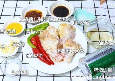步骤1准备食材:鸡翅根4个、青椒2个、红椒2个、姜1块、蒜3瓣、料酒1汤匙、豆瓣酱1汤匙、生抽1汤匙、糖1茶匙、啤酒半罐、盐1茶匙、油适量 。步骤2姜切片 。步骤3蒜切片 。步骤4青椒切块 。步骤5红椒切块 。步骤6鸡翅根剁块 。步骤7鸡翅...