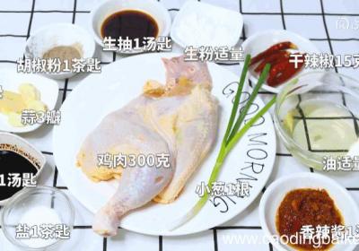 步骤1准备食材:鸡肉200克、姜1块、蒜3瓣、小葱1根、干辣椒5个、香辣酱1汤匙、胡椒粉1茶匙、生粉1汤匙、生抽1汤匙、老抽1茶匙、盐1茶匙、鸡精1茶匙、油适量 。步骤2姜切片 。步骤3蒜切片 。步骤4葱切葱花 。步骤5干辣椒切段 。步骤6...