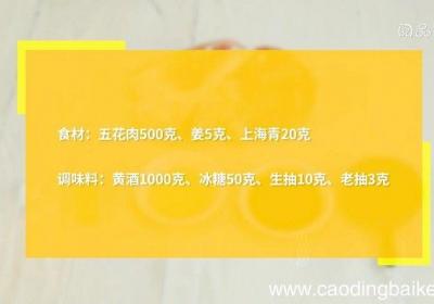 发布时间: 12小时前步骤1食材:五花肉500克、姜5克、上海青20克、黄酒1000克、冰糖50克、生抽10克、老抽3克 。步骤2五花肉切块 。步骤3姜切片 。步骤4上海青对半切开,放入沸水锅中,煮40秒,捞出备用 。步骤5锅中放入黄酒、加入姜片煮沸,放入五花肉...