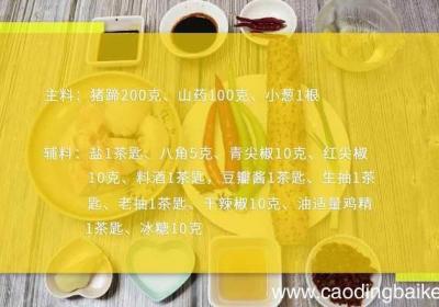 步骤1准备食材:猪蹄200克、山药100克、小葱1根、盐1茶匙、八角5克、青尖椒10克、红尖椒10克、料酒1茶匙,豆瓣酱1茶匙、生抽1茶匙、老抽、干辣椒10克、油适量、鸡精1茶匙、冰糖10克 。步骤2猪蹄洗净 。步骤3山药去皮切滚刀 。步骤...