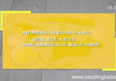 步骤1食材:熟鸭腿1只,蒜苗200克,小米椒3个,蒜2瓣,姜2克,大葱10克 。调味料:食用油8克,盐1克,酱油2克,鸡精2克 。步骤2蒜苗切段 。步骤3小米椒切片 。步骤4蒜切片 。【炸熟的鸭腿 炸熟的鸭腿怎么做好吃】步骤5姜切片 。步骤...