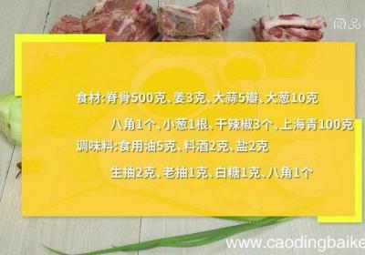 步骤1食材:脊骨500克、姜3克、大蒜5瓣、大葱10克、八角1个、小葱1根、干辣椒3个、上海青100克 。调味料:食用油5克、料酒2克、盐2克、生抽2克、老抽1克、白糖1克 。步骤2上海青对半切开,放入沸水锅中焯烫30秒,捞出备用 。步骤3...