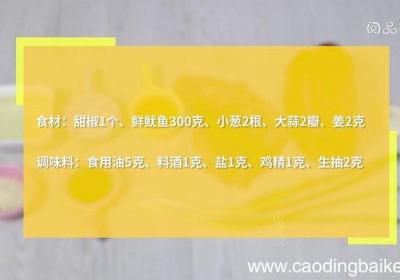 步骤1食材:甜椒1个、鲜鱿鱼300克、小葱2根、大蒜2瓣、姜2克 。调味料:食用油5克、料酒1克、盐1克、鸡精1克、生抽2克 。步骤2鲜鱿鱼切段 。步骤3甜椒切块、小葱切段、大蒜切末、姜切丝 。步骤4热锅倒油、油温5成热时、下蒜末、炒香 。...