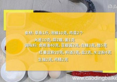步骤1食材:草鱼1斤,泡椒10克,鸡蛋2个,大葱10克,蒜2瓣,姜1克调味料:食用油40克,豆瓣酱2克,白糖3克,醋5克,生抽2克,鸡精2克,红薯淀粉20克,料酒3克,盐2克、水淀粉4克步骤2草鱼两面划花刀,加料酒,抹匀腌制15分钟 。步骤...