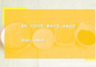 步骤1食材:红豆60克,薏米60克,大米80克 。调味料:冰糖4克 。步骤2红豆用清水浸泡5小时,泡至红豆半软,薏米用清水浸泡4小时,泡至胀大,冰糖用温水融化 。步骤3大米洗净,倒入电饭锅中,加入红豆、薏米、冰糖水,再倒入清水至刚没过食材,...